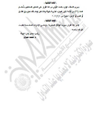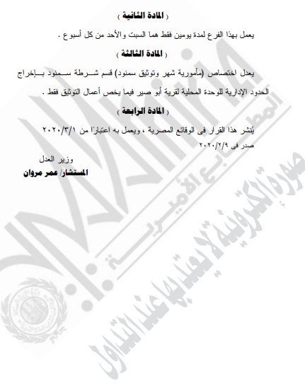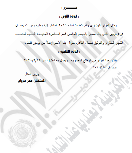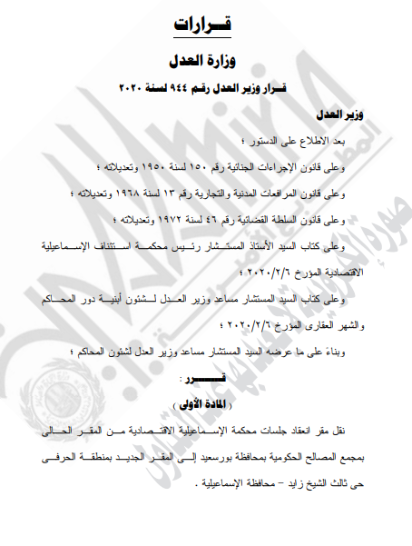 غير مصنف قرارات وزير العدل قرار رقم 944 لسنه2020م – قرر : ( نقل مقر إنعقاد جلسات محكمة الإسماعيلية الأقتصادية ) By Dawod Dawod on فبراير 26, 2020 - Category : غير مصنف - Tags : 0