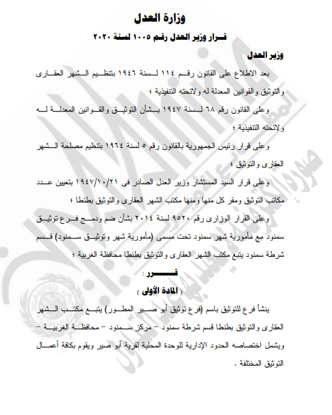 غير مصنف قرارات وزارة العدل – قرار رقم 1005 لسنه 2020م – قرر : بنشأ فرع للتوثيق بأسم ( فرع توثيق أبو صير المطور ) By Dawod Dawod on فبراير 26, 2020 - Category : غير مصنف - Tags : 0