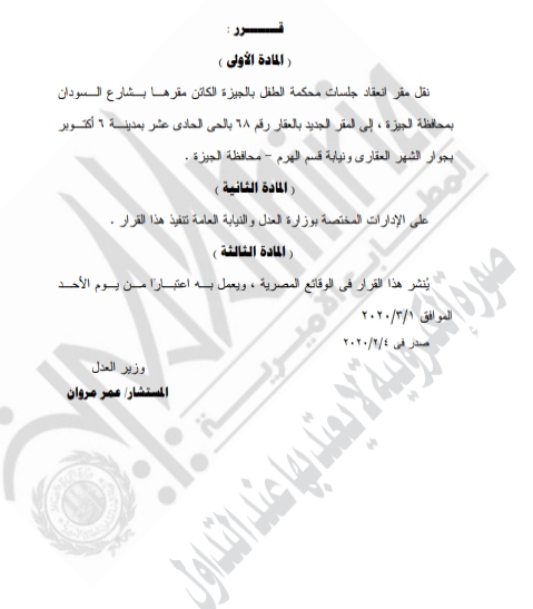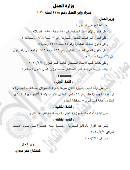 غير مصنف قرارات وزارة العدل قرار وزير العدل رقم 1118 لسنه 2020م قرر ( نقل مقر نيابة الطفل بالجيزة ) By Dawod Dawod on مارس 3, 2020 - Category : غير مصنف - Tags : 0