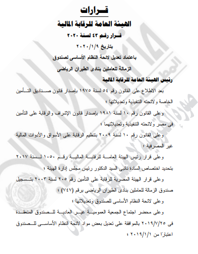 غير مصنف قرارات الهيئة العامة للرقابة المالية – قرار رقم 43 لسنه 2020م – ( بإعتماد تعديل لائحة النظام الأستاسي لصندوق الزمالة للعاملين بنادي الطيران الرياضي ) . By Dawod Dawod on فبراير 29, 2020 - Category : غير مصنف - Tags : 0