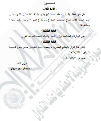 غير مصنف قرارات وزارة العدل قرار وزير العدل رقم1117 لسنه 2020م قرر [ نقل مقر إنعقاد جلسات( محكمة دشنا الجزئية ومحكمة دشنا لشئون الأسرة) By Dawod Dawod on مارس 2, 2020 - Category : غير مصنف - Tags : 0