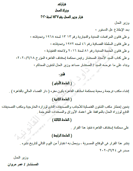 غير مصنف قرارات وزارة العدل قرار وزير العدل رقم 1537 لسنه 2020م قرر (إنشاء مكتبة ترجمة رسمية ) By Dawod Dawod on مارس 15, 2020 - Category : غير مصنف - Tags : 0
